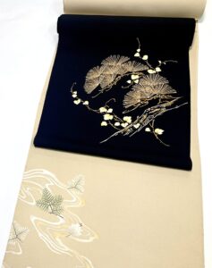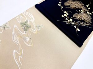 フジモト制作の付下げ「流水に松」と、染の川勝制作の染九寸帯「若松に蔓」