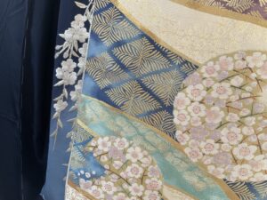 細かな表現が見どころの、となみさんによる紹巴。出過ぎない程度に桜モチーフも含まれているところがポイントです。流れのある柄表現も、振袖の雰囲気によく沿っています。