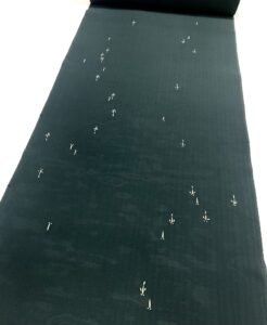 同じく水辺がテーマの薄もの紬九寸。これではまるでメダカちゃんたちが逃げ惑う図のようだと、家族から指摘されました。実際に、白鷺のような大きめの鳥がメダカを狙うことなどあるでしょうか。帯の制作は小紋と同じフジモト。