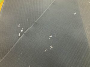 この遠さだと何なのかよく分からないですかね。メダカたちの姿を白揚げで描いてもらった小紋になります。数ヶ月前に見せられた見本反より明らかにメダカの数が多いような気がしますが、それはサービスなんでしょうか。